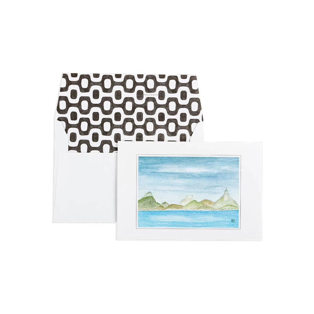 E para dar um charme, os cartões dobrados são acompanhados de envelopes impresso com o mosaico de pedras portuguesas dos calçadões das praias de Ipanema e Leblon.